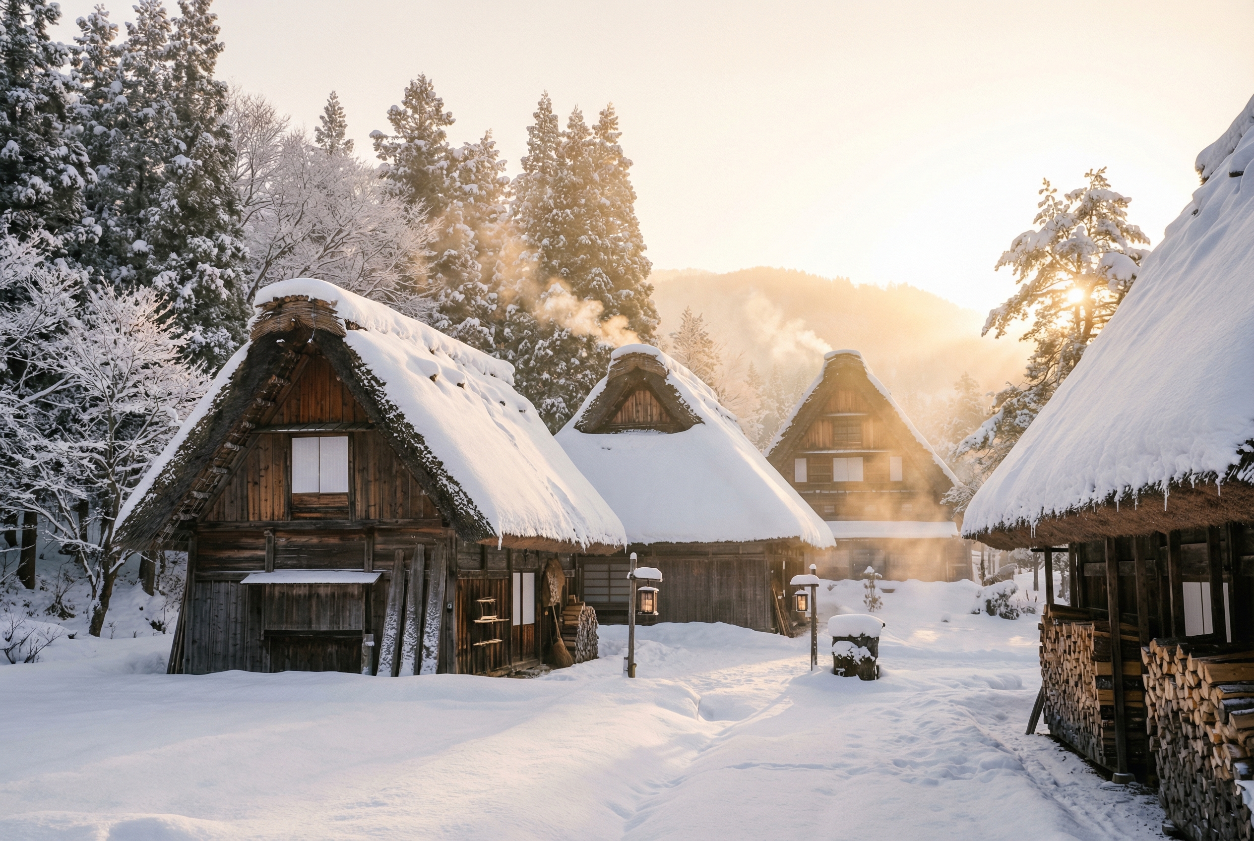 Фотореалистичное изображение, снятое на Canon EOS R5, объектив мм, зима на Хоккайдо, Япония, на котором изображены традиционные дома минка с крутыми, покрытыми снегом крышами, в окружении безмятежного снежного пейзажа с высокими, покрытыми снегом деревьями и мягким, светящимся восходящим солнцем, создающим спокойную и живописную зимнюю сцену, стиль «кабинкор», ISO 200, стиль National Geographic.
