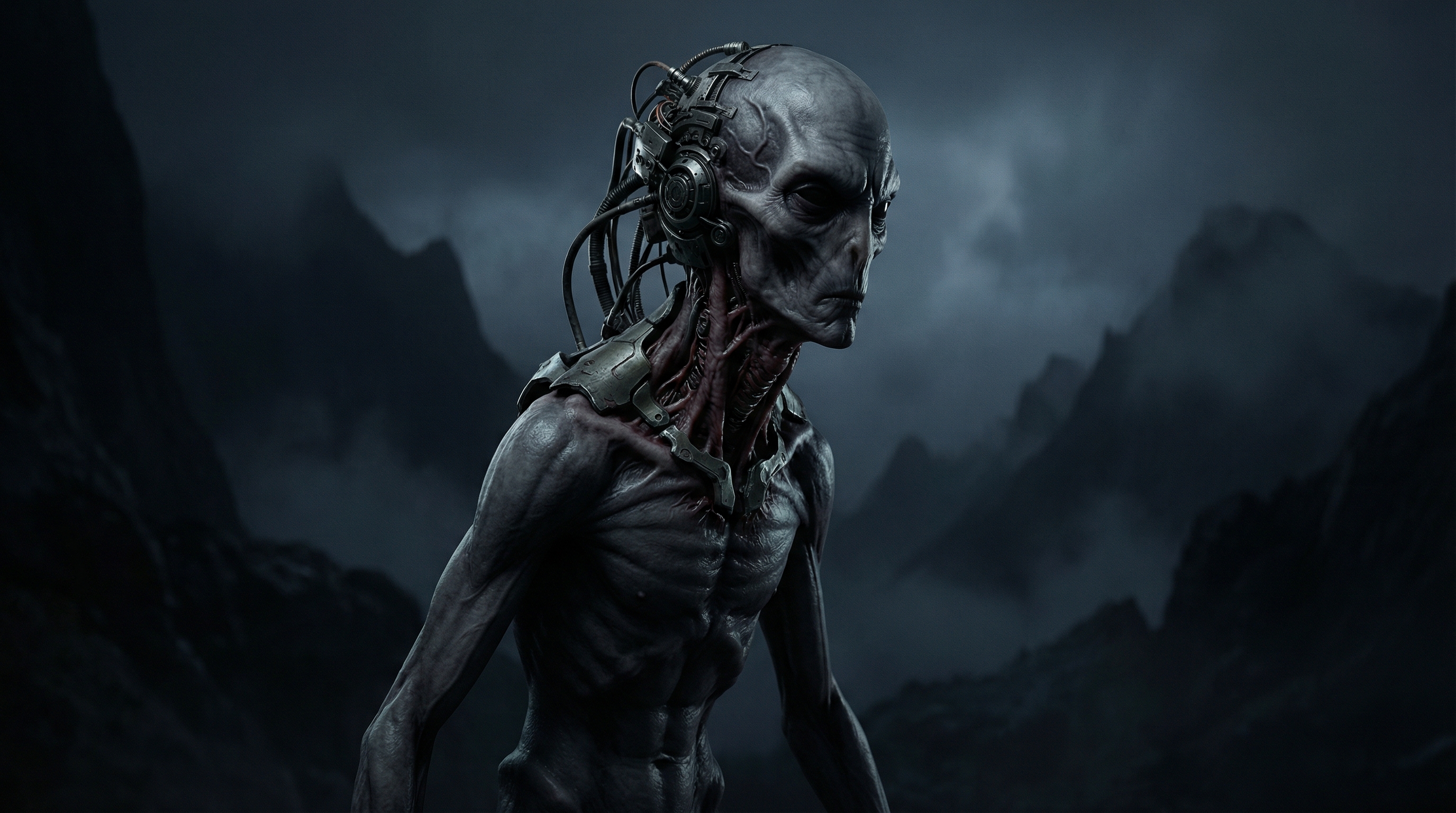 Гиперреалистичный кинематографичный кадр высокодетализированного инопланетного существа-киборга с потусторонним пугающим видом. Лицо очень длинное и вытянутое, сложные электрические механизмы и части машин интегрированы вокруг головы и шеи. Кожа темно-бледная, пепельного оттенка, с гладкой текстурой и толстыми выступающими венами. Тело, руки и ноги хрупкие и тонкие. Поврежденная футуристическая броня покрывает шею, биомеханически вырастает из кожи, органическое слияние металла и плоти. Фон: темный жуткий горный пейзаж, туманная ночь, мрачная атмосфера. Драматическое объемное освещение, контрастные тени, разрешение 8K, фотореализм, эстетика биомеханического ужаса, резкий фокус, детализированная текстура кожи и металла.