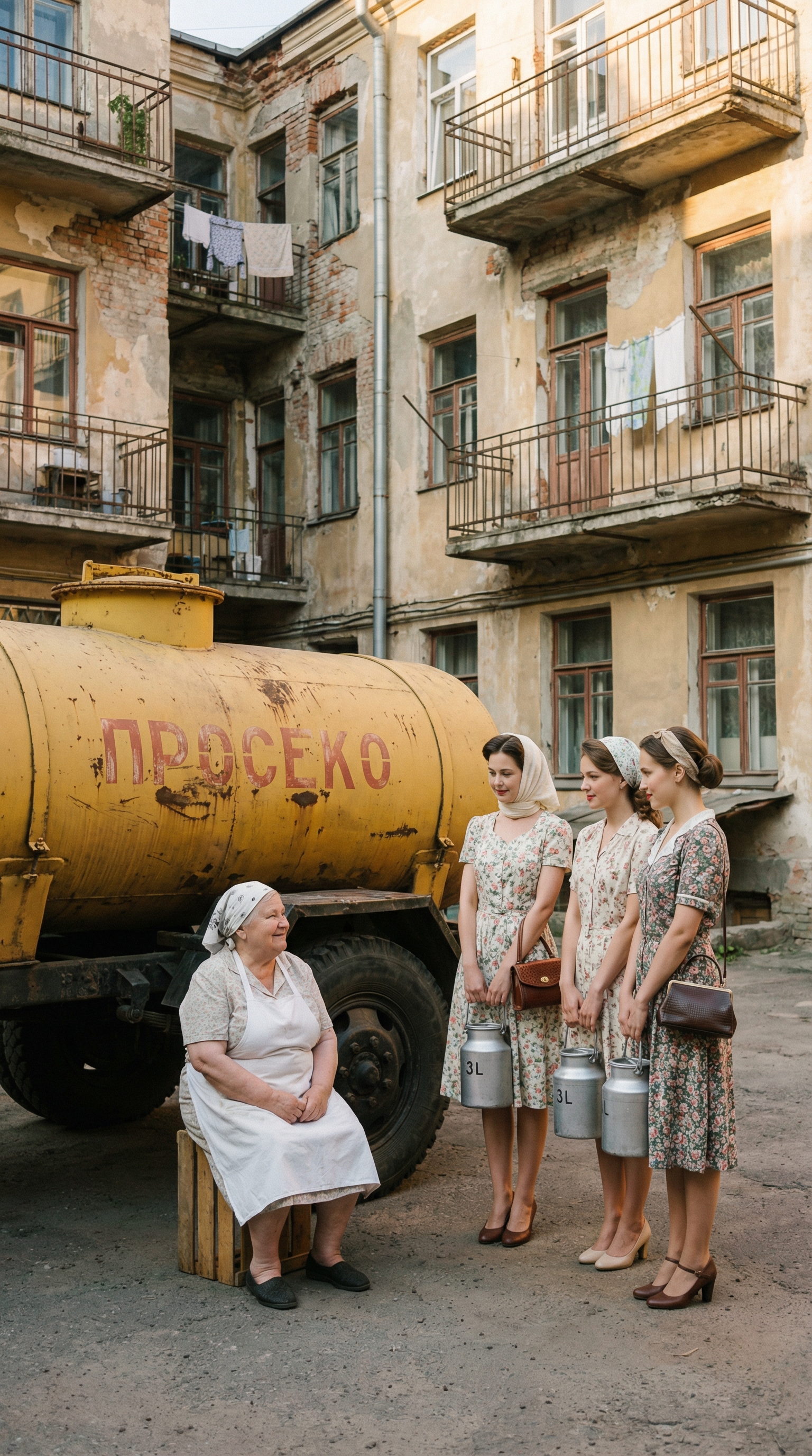 Советский двор 1950-х годов, реалистичная кинематографичная сцена. На переднем плане большая жёлтая цистерна на прицепе с красной надписью «ПРОСЕКО», слегка выцветшая краска, металлическая поверхность с потертостями. Рядом сидит пожилая полная женщина в белом фартуке и платке, улыбается, сидит на деревянном ящике. Напротив неё стоят три молодые женщины в винтажных цветочных платьях до колена, аккуратные причёски, лёгкие платки на голове, держат металлические бидоны с маркировкой «3L». У них небольшие ретро-сумочки, туфли на каблуке.