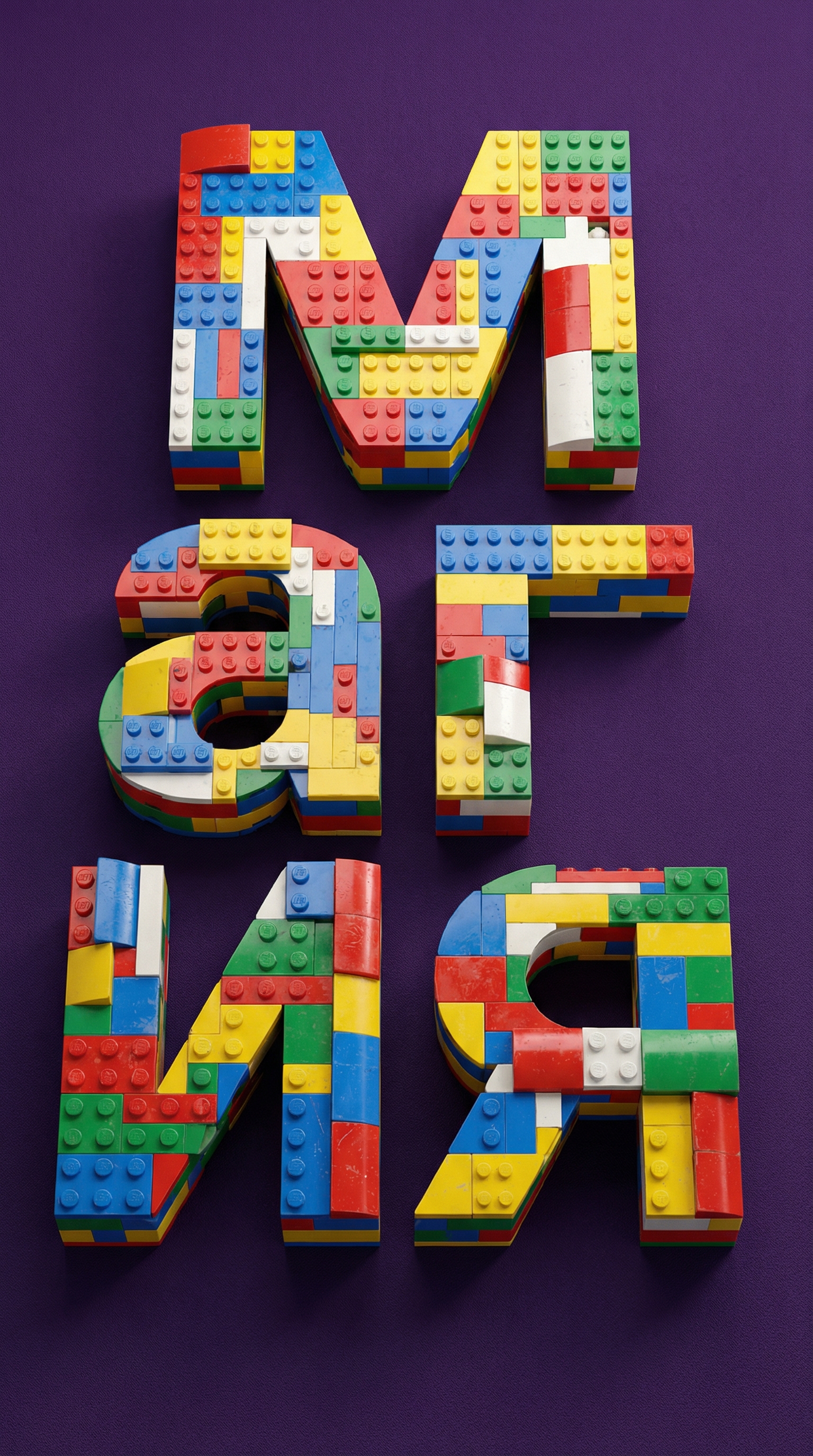 Текст названия "Магия" тщательно собран из ярких разноцветных кирпичиков LEGO, каждая буква которых состоит из красных, синих, желтых, зеленых и белых кусочков. Кирпичики LEGO имеют реалистичную текстуру, видимые заклепки и небольшие различия в размерах, что придает им аутентичный вид. Мягкие тени и едва заметные отражения увеличивают глубину изображения. Фон выполнен в насыщенном фиолетовом цвете, что создает сильный контраст с красочной конструкцией LEGO. Сверхдетализированное освещение, четкие текстуры и отделка с высоким разрешением.