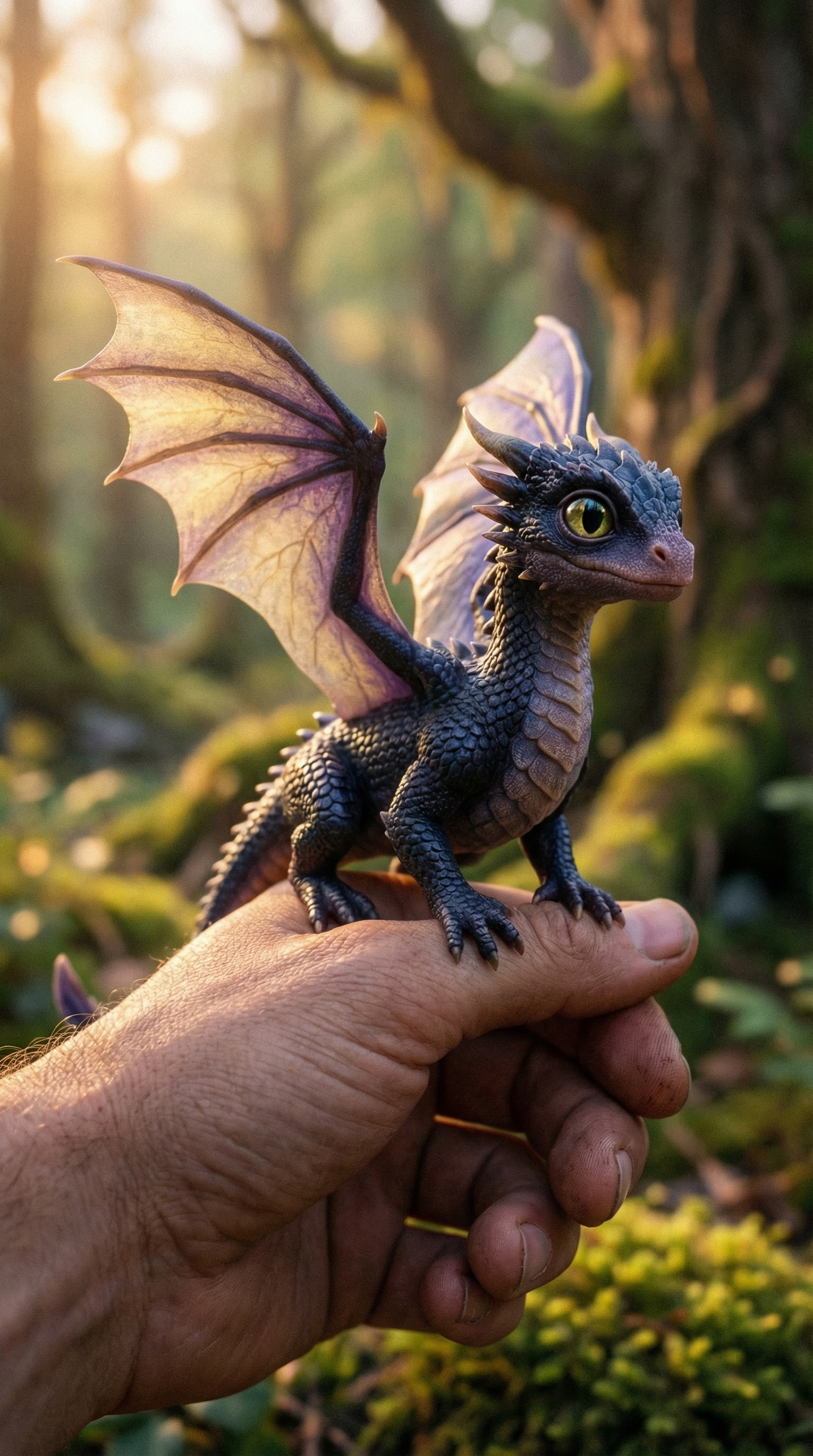 Создай высокодетализированное изображение маленького фантастического дракончика, сидящего на человеческой руке. Дракончик должен быть миниатюрным, с крупными выразительными глазами, чешуёй тёмных оттенков и мягким блеском на крыльях. Передай ощущение реалистичной фактуры: мелкие чешуйки, бархатистая кожа, полупрозрачные тонкие крылья. Освещение — тёплое и мягкое, фон слегка размытый. Атмосфера — дружелюбная и волшебная.