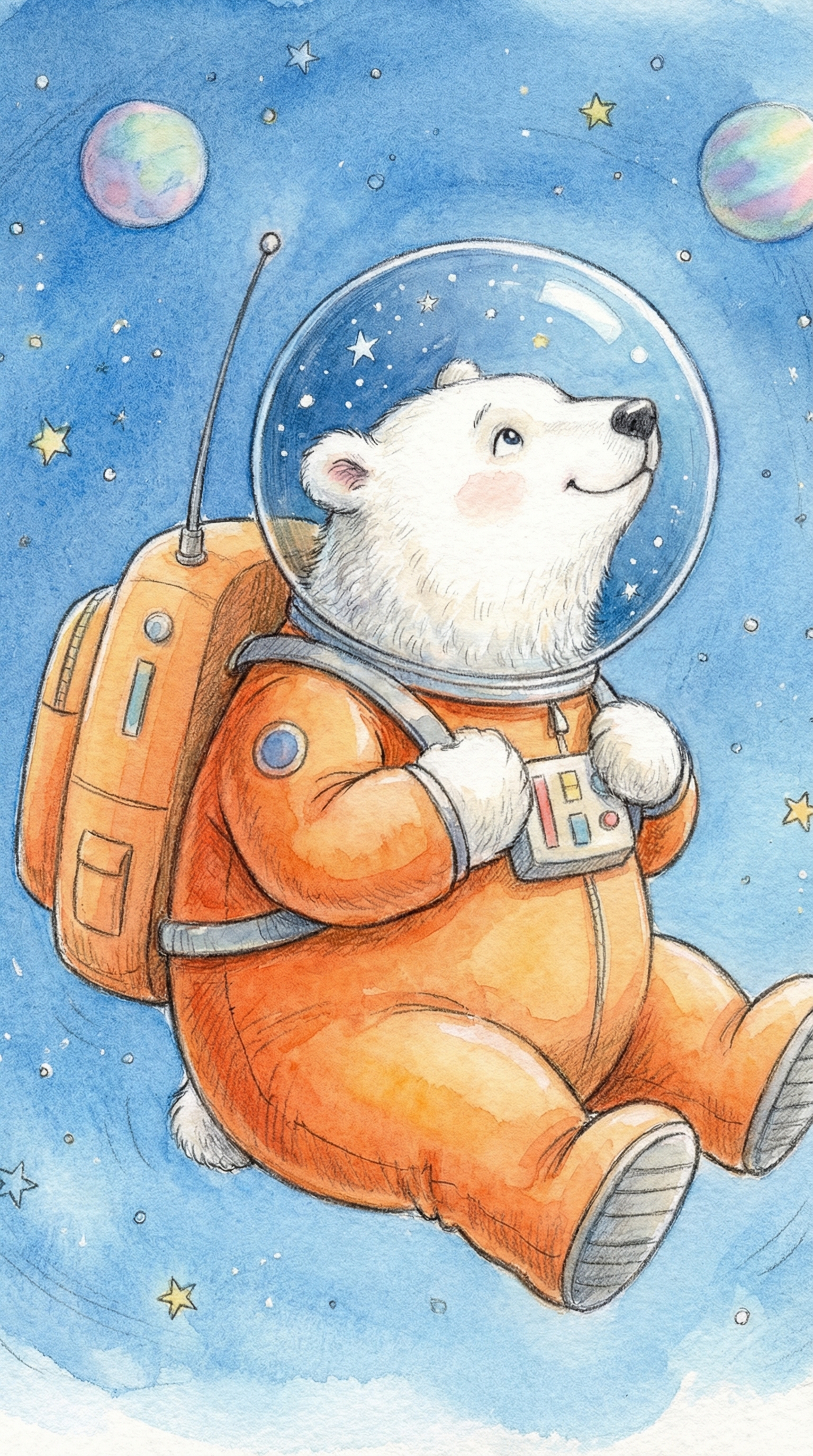 Милый пушистый белый медведь в оранжевом скафандре космонавта, плавающий в открытом космосе. Прозрачный шлем с отражением звёзд. Медведь смотрит вверх с мечтательным выражением. Мягкая детская книжная иллюстрация, акварельная текстура, тёплые пастельные тона, голубой космический фон с маленькими звёздами и планетой. Рисованный стиль с видимыми карандашными штрихами, уютная и добрая атмосфера, детализированная шерсть, объёмный рюкзак с антенной.