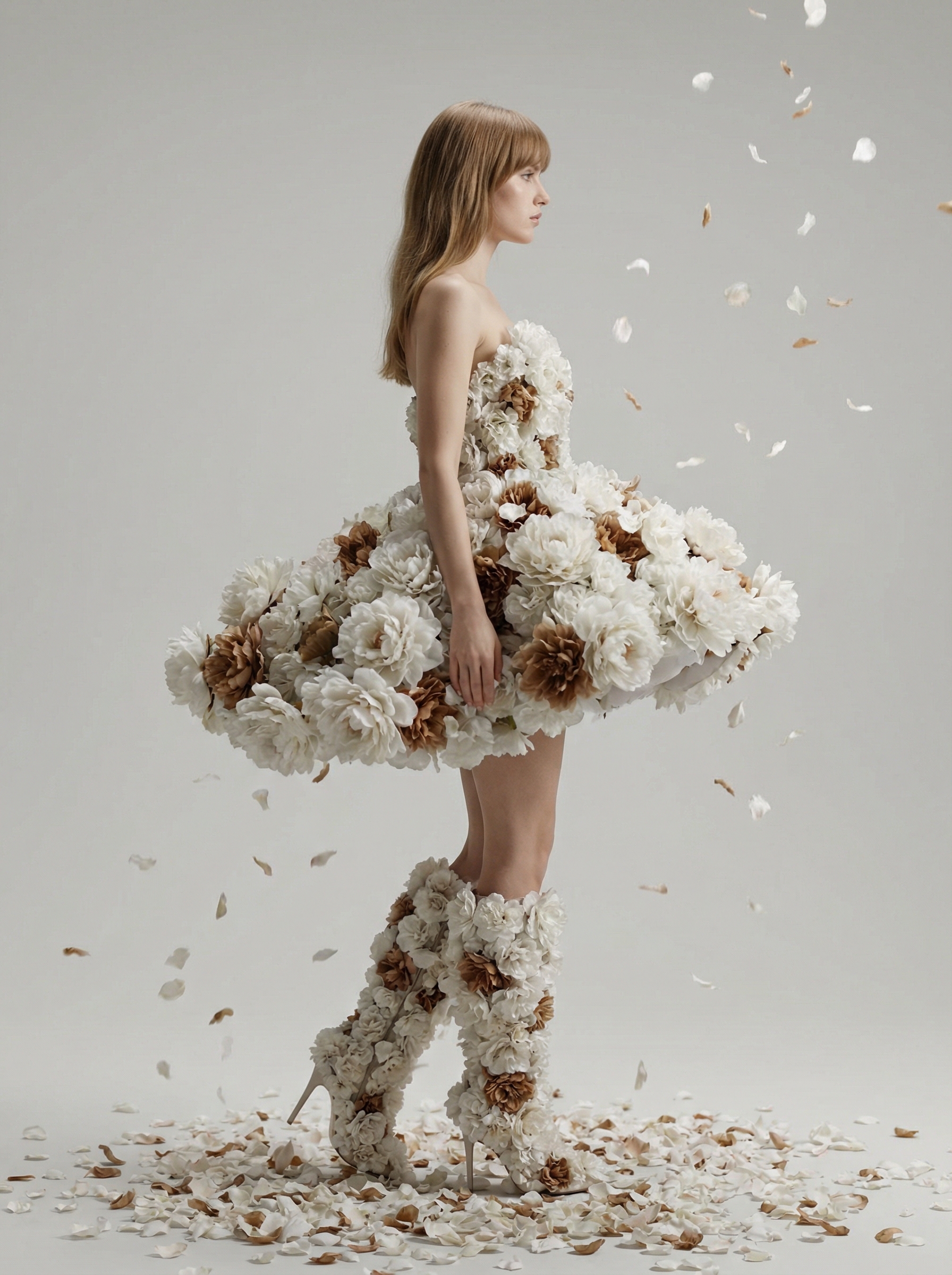 Девушка в профиль в авангардном мини-платье, полностью состоящем из объемных белых цветов с коричневыми вставками. Пышная парящая цветочная юбка, высокие цветочные сапоги на шпильке. Светло-каштановые волосы с челкой. Пол усыпан лепестками, лепестки падают в воздухе. Нейтральный светло-серый фон, мягкий студийный свет. Fashion-фотография, сюрреализм, фотореализм, высокая детализация. 85mm, малая глубина резкости, сверхреализм, чистая цветокоррекция, изящная композиция.