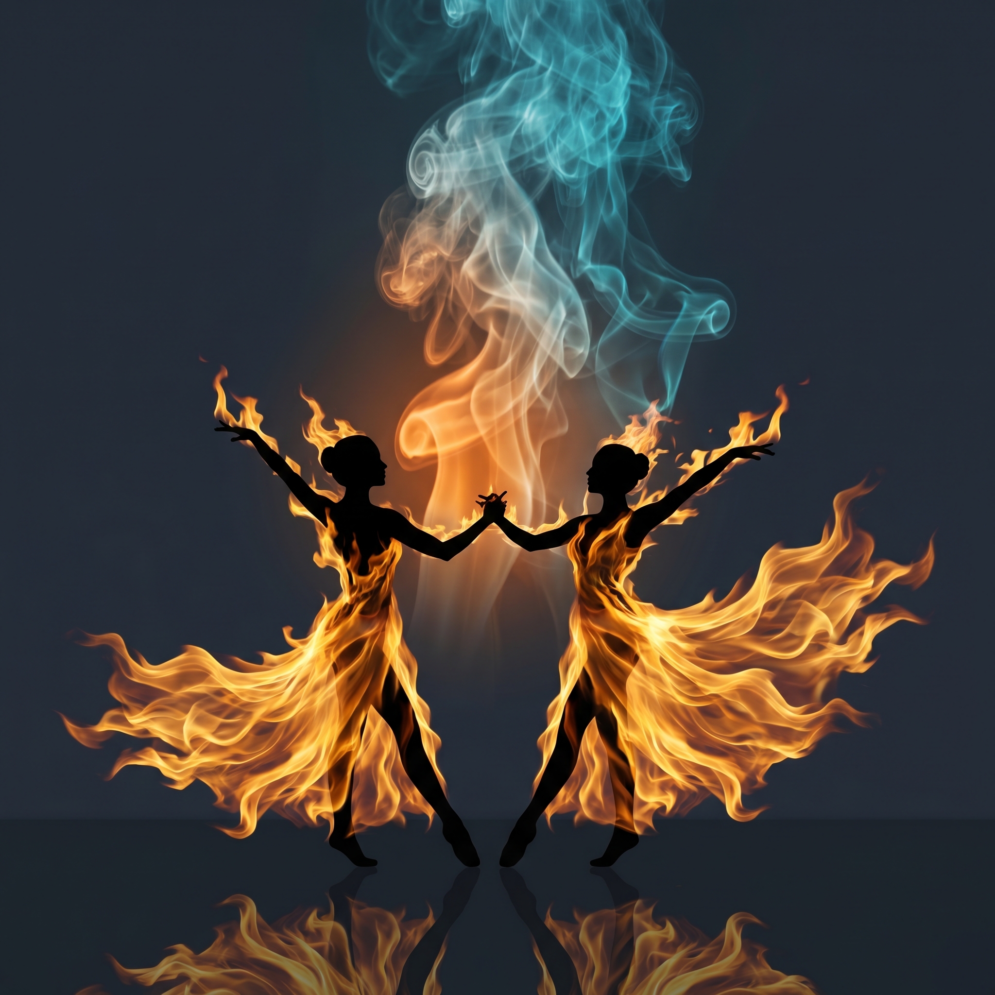 Два силуэта танцоров, охваченных живым пламенем, исполняют грациозный парный танец на зеркальной поверхности в кромешной тьме. Их тела — чёрные силуэты, задрапированные в «одежды» из огня: потоки янтарного и золотого пламени струятся вокруг фигур подобно шёлковым шлейфам. Руки тянутся друг к другу, соединяясь в центре. Над ними поднимается мощный столб дыма — у основания подсвеченный тёплым оранжевым, переходящий в холодный полупрозрачный сине-бирюзовый по мере подъёма. Зеркальный пол внизу отражает огненное зрелище. Контрастная палитра: тёмный серо-синий фон, яркое золото и янтарь пламени, бирюзовый дым. Сюрреалистичный цифровой арт, кинематографичное освещение, мистическая и романтичная атмосфера, симметричная композиция, фронтальный ракурс.