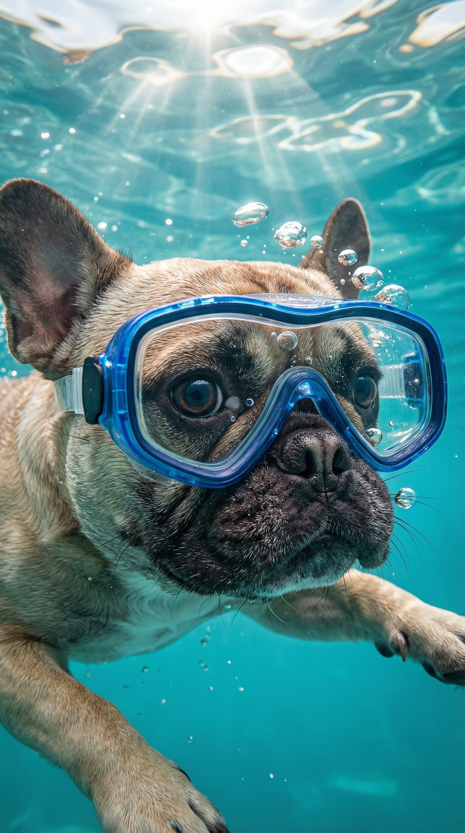 Французский бульдог в голубой маске для плавания плывёт под водой, крупный план мордочки, пузырьки воздуха вокруг, бирюзовая вода, солнечные блики на поверхности, реалистичная фотография, высокая детализация шерсти и мокрой кожи, выразительные глаза, динамичная подводная съёмка, яркое естественное освещение, с зум-объективом 35 мм, photorealistic
