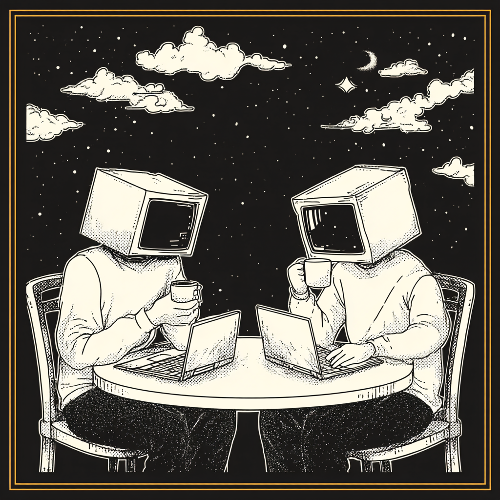 Минималистичная рисованная иллюстрация в стиле карты таро. Два картонных персонажа-мужчины с компьютерными мониторами вместо голов, дружно чокаются чашками кофе. Сидят за столиком в кафе, перед ними открытые ноутбуки. Фон: нарисованное черное небо, заполненное звездами и белыми пушистыми облаками. Все элементы, включая персонажей и фон, обведены тонкими черными линиями, создающими жирный контраст. Контуры четкие, цвета яркие и насыщенные. Мультяшный стиль, векторная эстетика, плоская иллюстрация, высокая детализация линий, художественный минимализм.