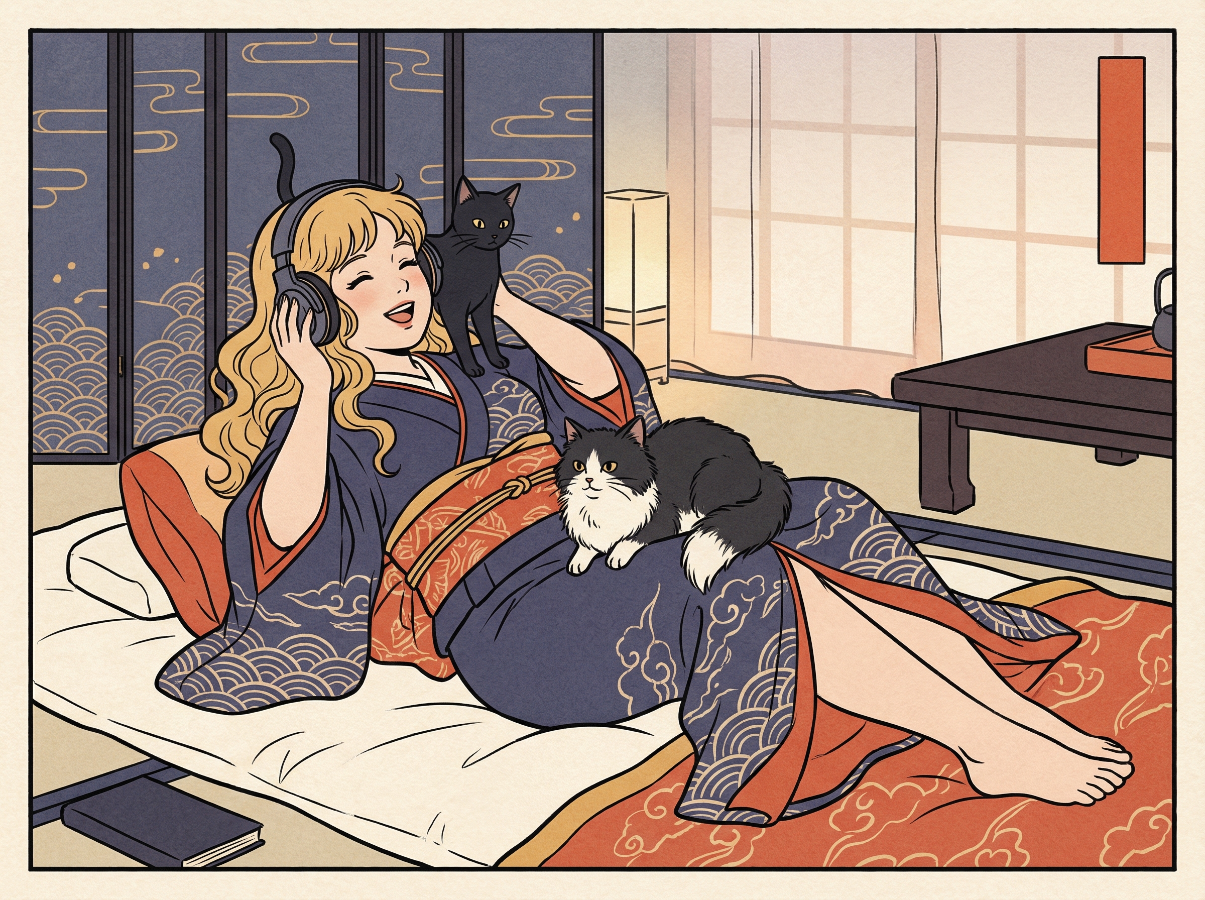 Девушка с пышными формами, светлые волнистые волосы, лежит на кровати в уютной комнате, слушает музыку в наушниках, расслабленное счастливое выражение лица. На плече сидит чёрный кот, на коленях — пушистый чёрно-белый кот. Стиль укиё-э: японская гравюра на дереве, характерные контурные линии, плоскостная композиция, приглушённая палитра с акцентами индиго, киновари и охры, текстура рисовой бумаги, традиционные узоры волн и облаков. Фон: интерьер комнаты с элементами японского стиля — ширма с узором, низкий столик, мягкое рассеянное освещение. Аниме-эстетика в духе укиё-э, детализированные складки одежды, выразительные глаза, художественная стилизация, высокое разрешение.