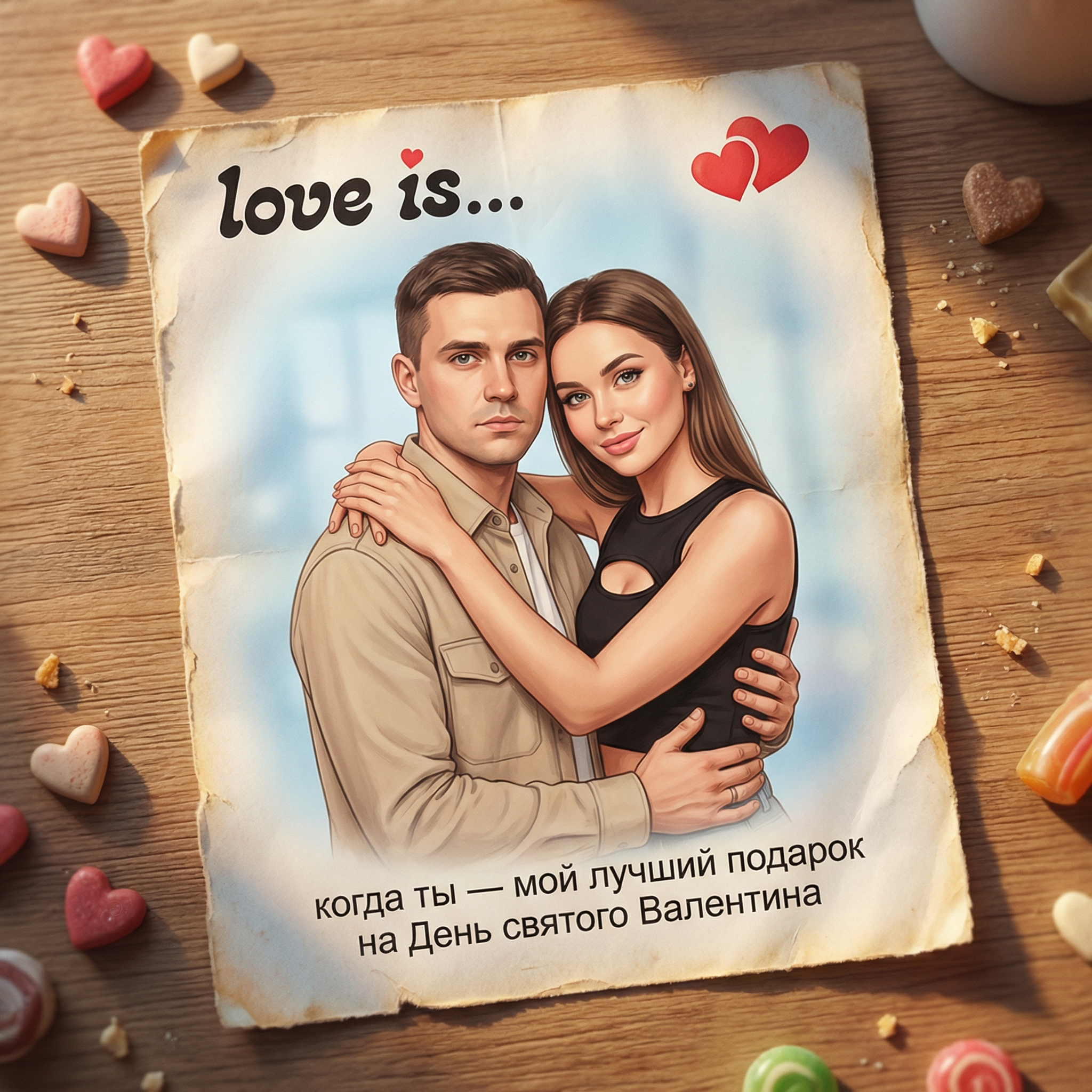 Основа: классический дизайн вкладыша жевачки «Love is…». Мягкие теплые цвета. Теплое освещение и атмосфера. Четкая лицевая детализация.