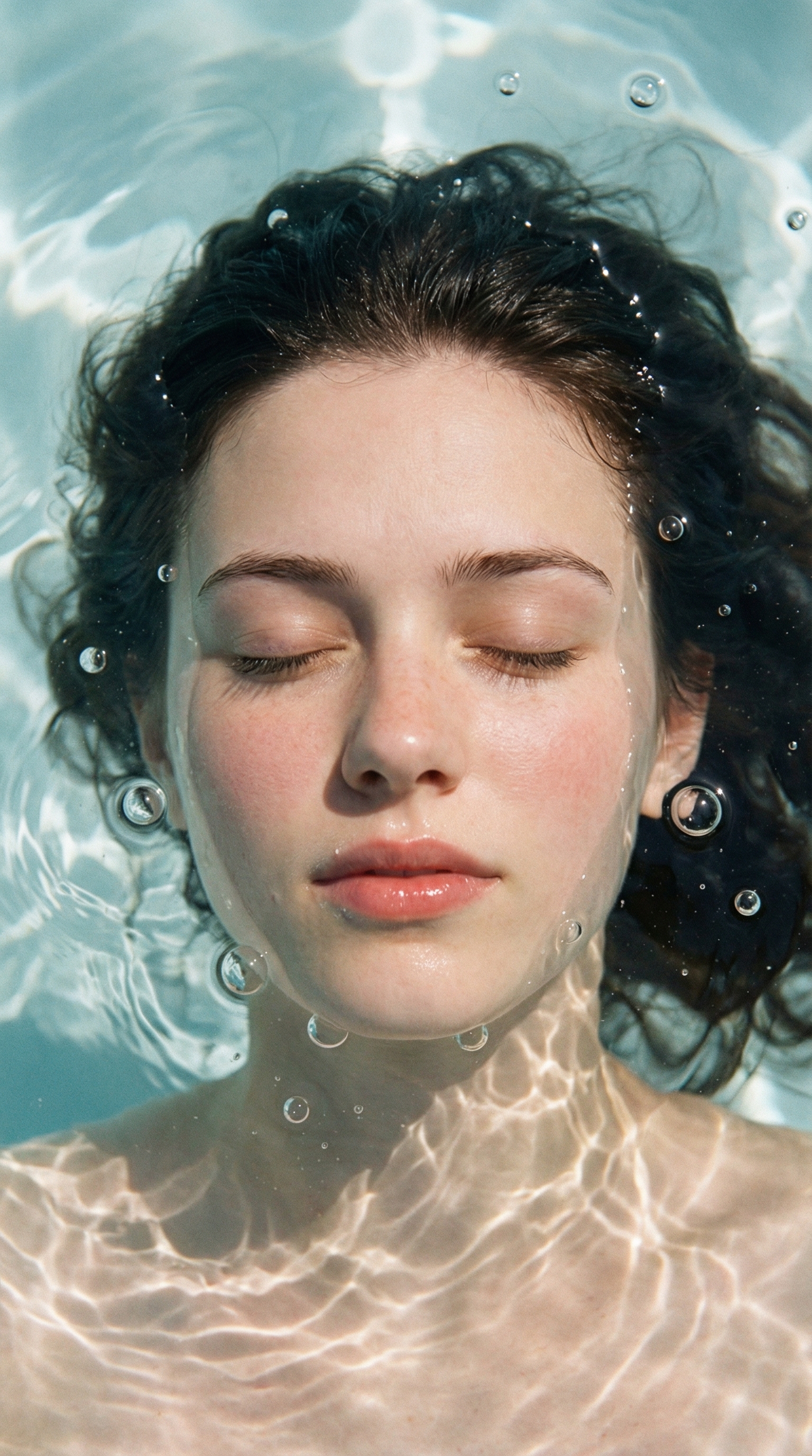 Портрет молодой женщины с закрытыми глазами, погружённой в чистую прозрачную воду. Лицо частично под водой, вокруг пузырьки воздуха и рябь. Кожа светлая с естественным румянцем на щеках, влажные губы с натуральным блеском, тёмные мокрые волосы развеваются в воде. Мягкое дневное освещение, эффект каустики от воды на коже. Эстетика спокойствия, чистоты, свежести. Фотореалистичный стиль, высокая детализация, кинематографичное качество