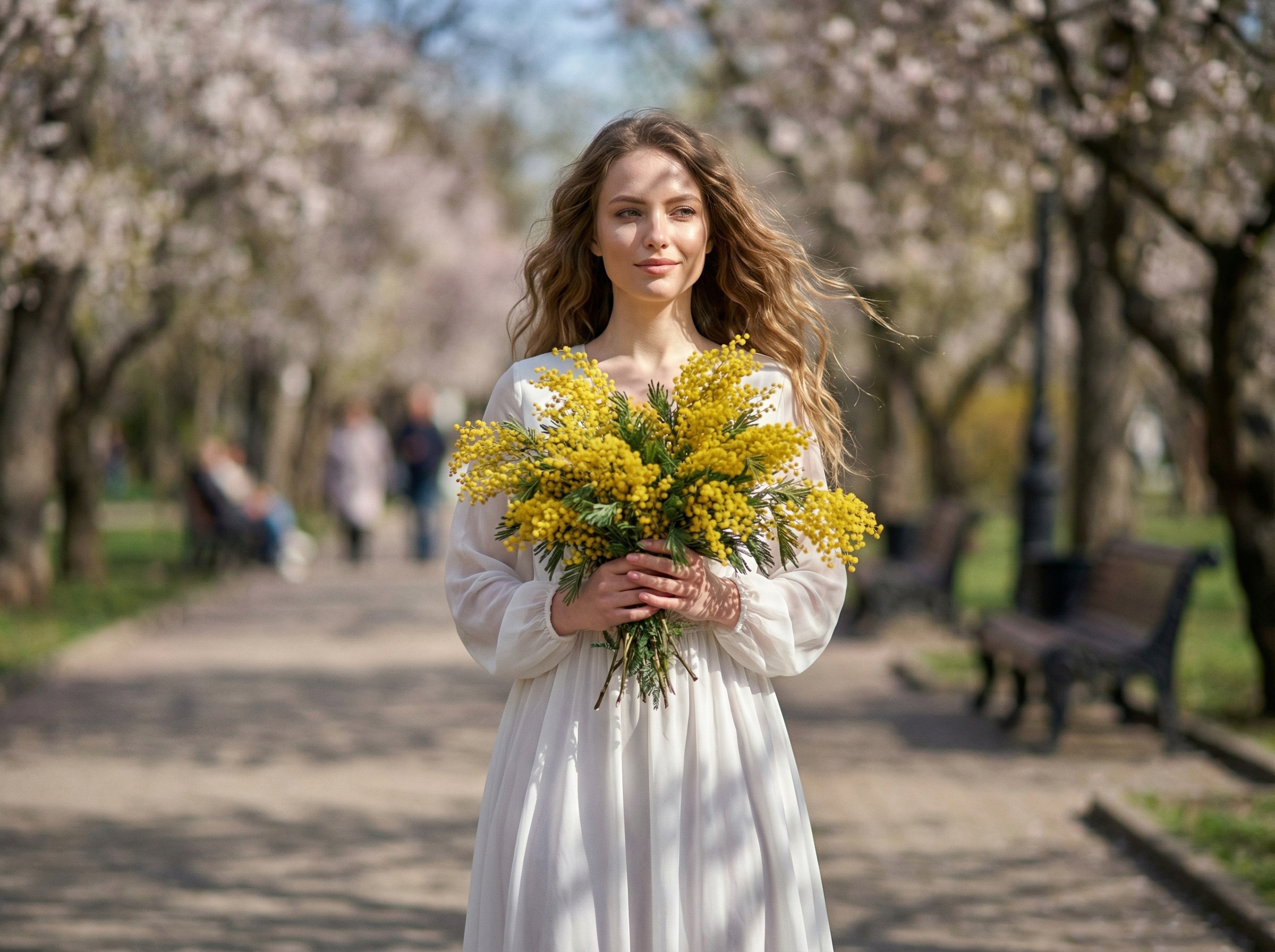 Ростовой вертикальный кадр. Девушка стоит на аллее парка, окружённая цветущими весенними деревьями. В руках она держит большой фактурный букет мимозы, который скрывает область груди и декольте. На ней струящееся полупрозрачное шифоновое платье молочно-белого цвета. Её длинные волнистые волосы развеваются на лёгком ветру. Солнечные лучи, пробиваясь сквозь листву, создают на лице и платье мягкие блики и узоры теней. Фон художественно размыт (боке), угадываются фигуры людей и скамейки вдали.
