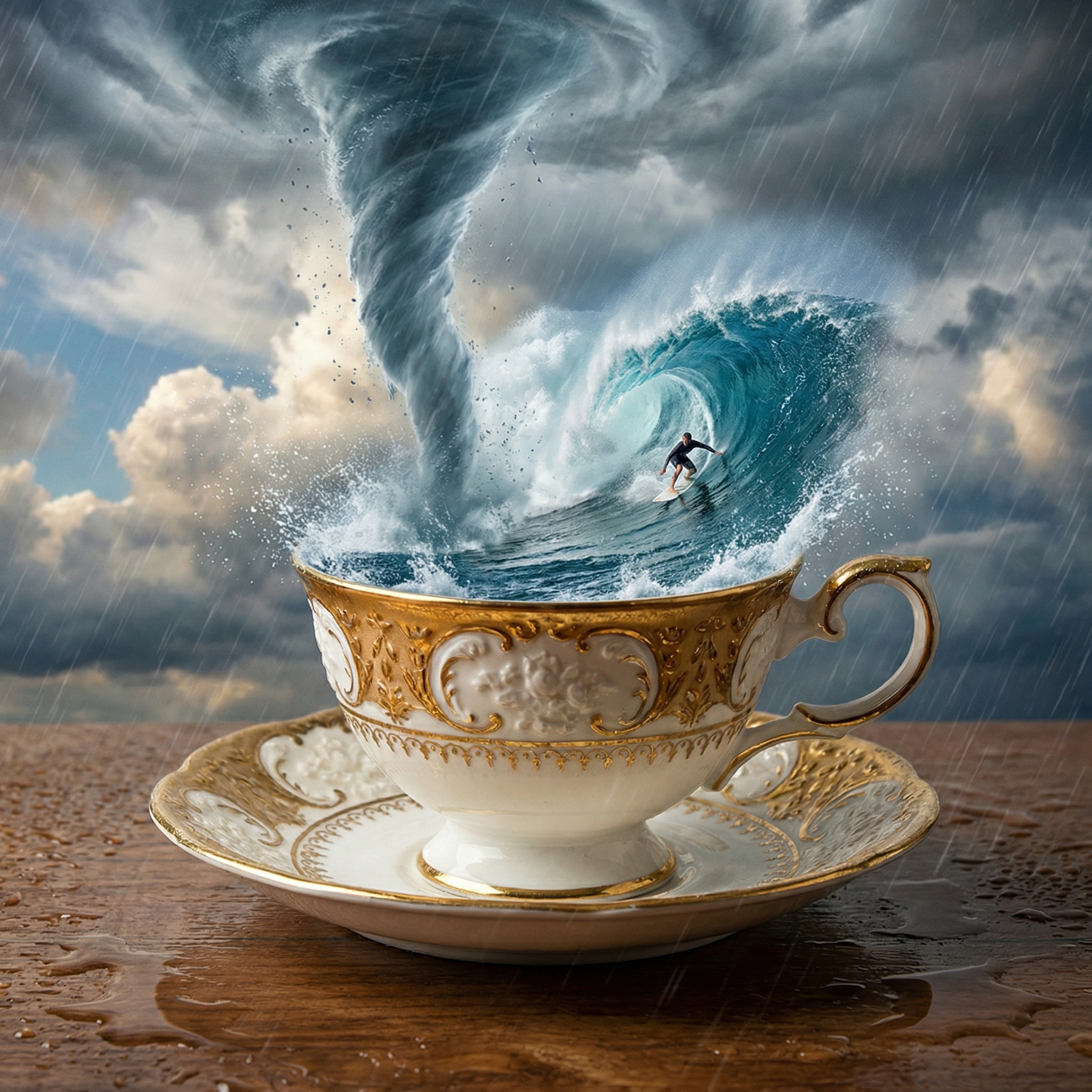 Чайная чашка из костяного фарфора викторианской эпохи с золотой отделкой и изящными фарфоровыми деталями на мокрой поверхности стола, наполненная бушующим океанским штормом. Серфер создает волну внутри чашки, в то время как огромный водяной смерч спиралью поднимается в небо. Дождь и океанские брызги выплескиваются из чайной чашки. Огня нет. Эффектные облака, динамичное освещение, реалистичная физика воды, высокодетализированная сюрреалистическая кинематографическая композиция.