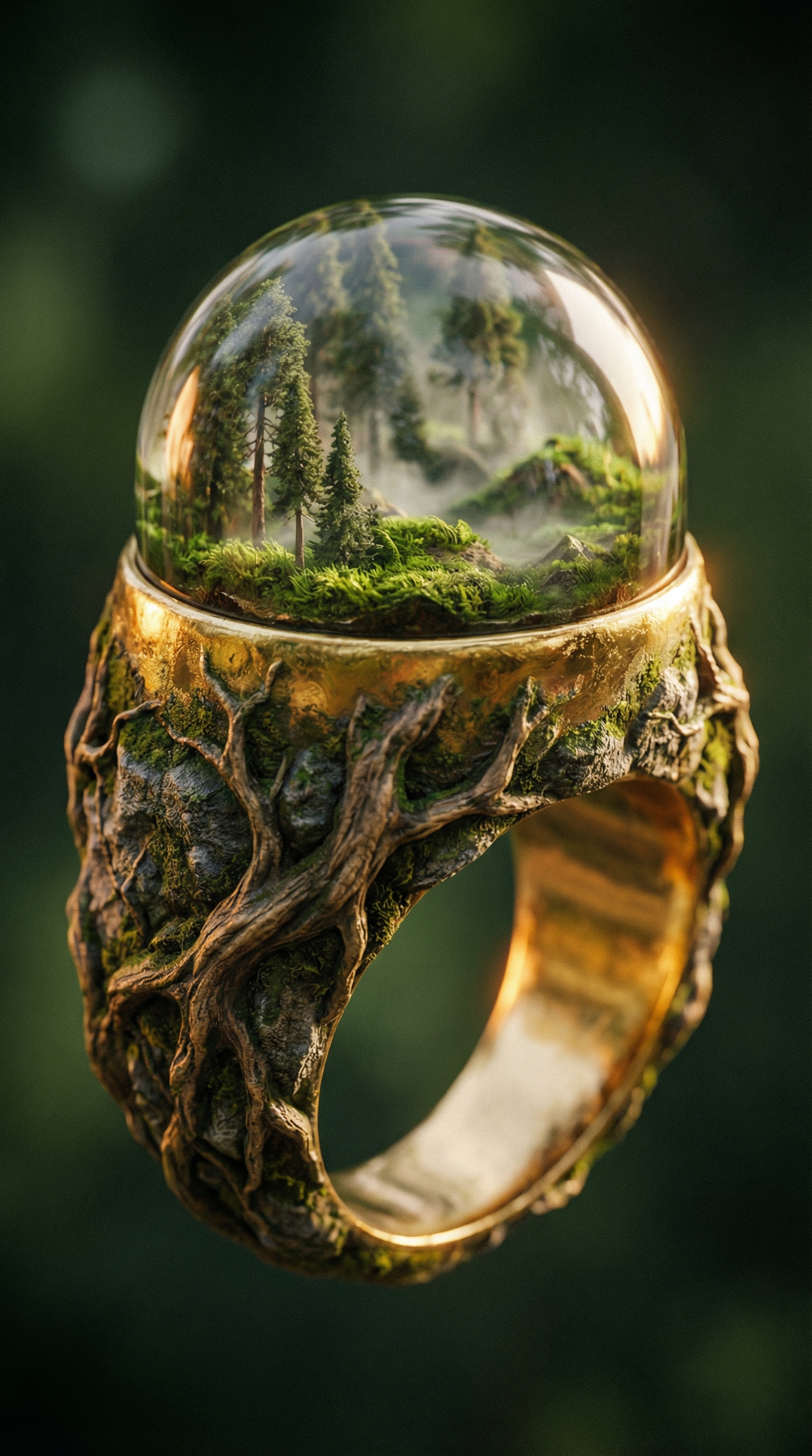 Ультрареалистичное макро‑изображение фантазийного кольца. Широкое массивное золотое кольцо с фактурой, похожей на скалы и корни деревьев. В верхней прозрачной части кольца из полированной эпоксидной смолы заключён миниатюрный лес: высокие хвойные деревья, густой зелёный мох, небольшие холмы, эффект тумана между деревьями. Смола образует купол, через который видно детализированный пейзаж, как внутри стеклянного шара. Тёплое мягкое освещение, отражения на поверхности смолы, кинематографический стиль. Малая глубина резкости, размытый тёмно‑зелёный фон, акцент на деталях дерева и золота
